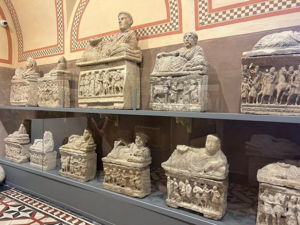 We began at the Archeological Museum, which is housed in the former hospital of the knights. It has displays of pottery, mosaics, funerary monuments, and more. It also has some pretty gardens.