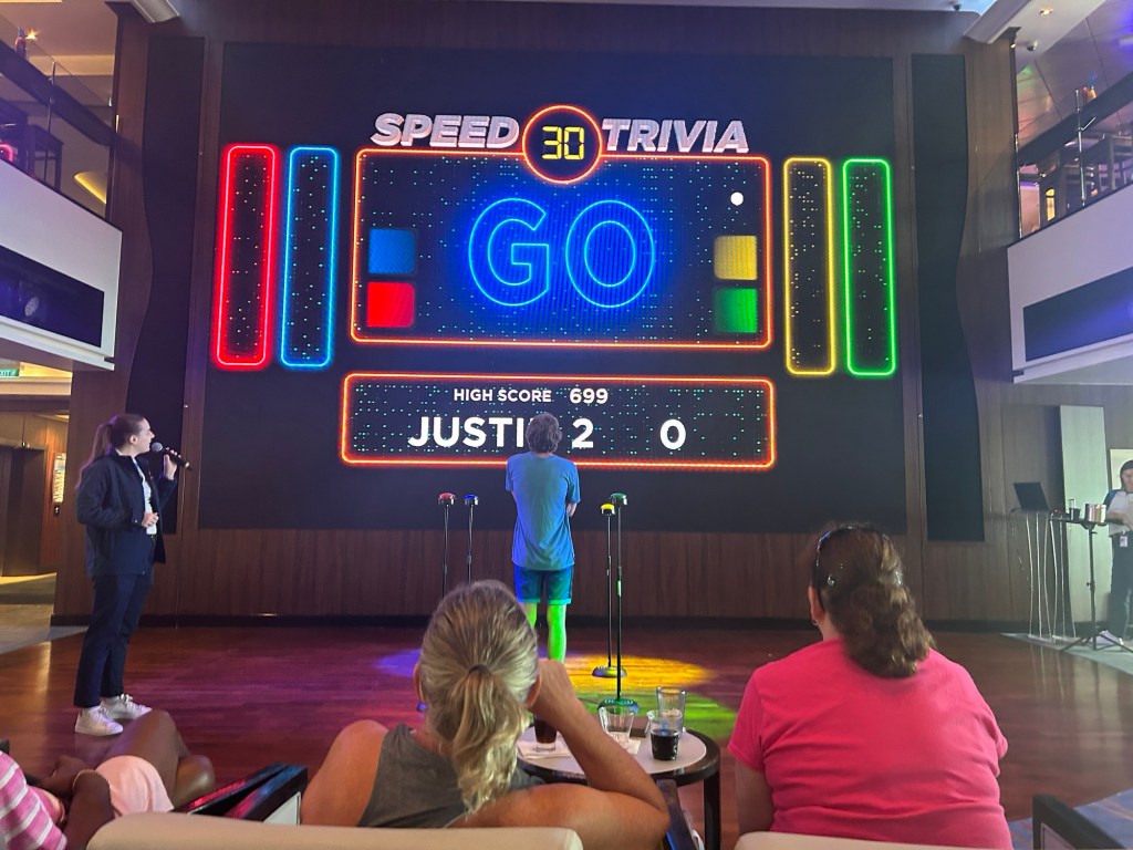 A full day at sea gave us a chance to relax on this beautiful ship. We joined a couple trivia games, watched an interesting Q&A with the captain and chief engineer, and checked out the action on the ship’s go-kart track. Might catch a show in the theatre tonight, but we’ll see.