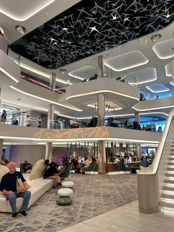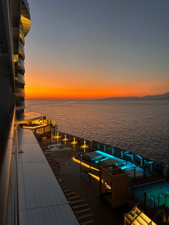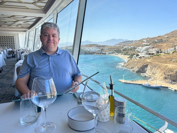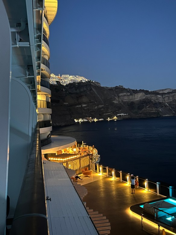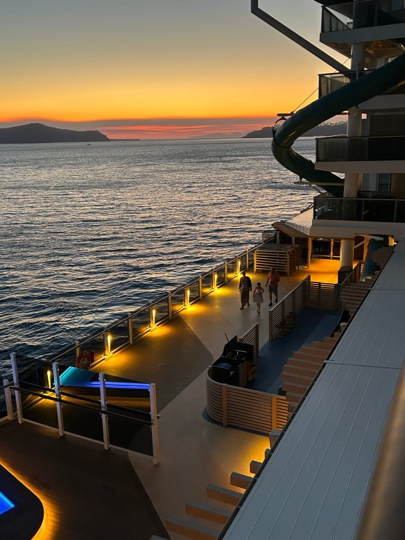 We have reservations at the specialty Italian restaurant tonight, but Chris has a tender tummy after a bout of food poisoning last night (shortly after I raved about how we’ve never had a bad meal in Greece). So we won’t be getting our money’s worth, but I’ll do my best!