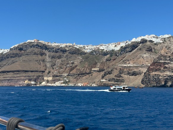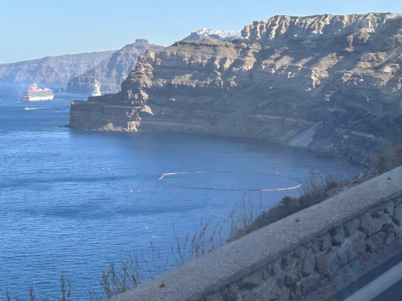Santorini is actually a group of islands that were formed by intensive volcanic activity; each violent eruption caused the collapse of the volcano’s central part, creating a large crater (caldera). Cruise ships now park in the caldera; it’s so deep that they can’t actually anchor, so they have to use their engines and thrusters to stay in place. (!)