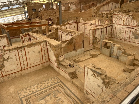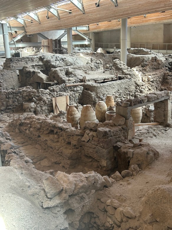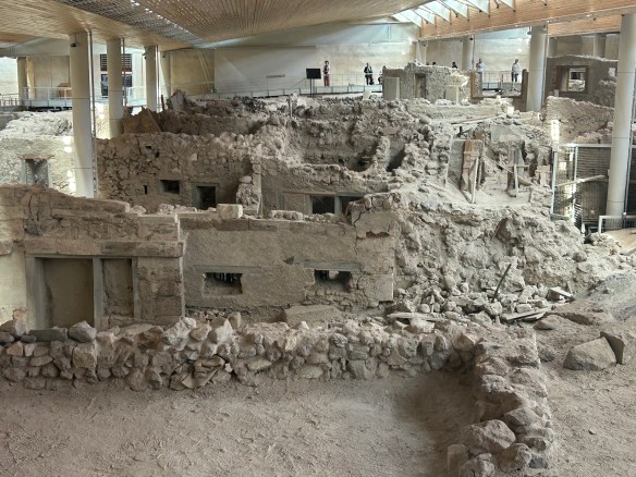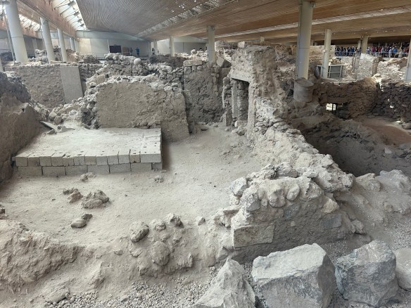 We started at the archeological site of Akrotiri, known as the Pompeii of the Aegean. Akrotiri was a Bronze Age settlement inhabited by the Minoans of Crete. It got destroyed in a catastrophic volcanic eruption around 1600 BC and was buried in volcanic ash, which preserved many objects and artworks. Unlike at Pompeii, no human remains were found, which suggests people had time to evacuate. The site was unearthed in 1967 and excavations are still going on.