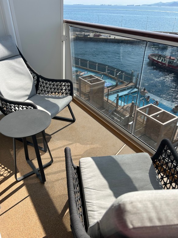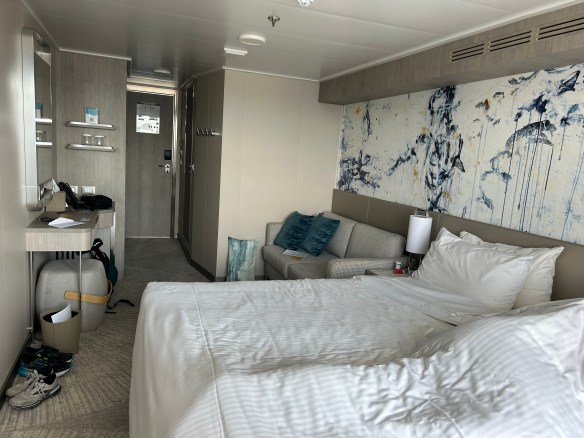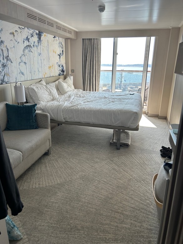 I haven’t seen too much of the ship yet, but the staterooms certainly are beautiful (padded balcony chairs…what a luxury!) Our cabin seems incredibly spacious, but that may just be because a) we’re minimalist packers and b) we’re used to squeezing four people in a room.