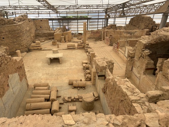 The cataclysmic volcanic eruption at nearby Santorini in 1600 BC (did I forget to mention that it was one of the largest eruptions in human history, with the force of 250 nuclear bombs?) hastened the decline of Minoan civilization, and Knossos was abandoned by 1350 BC.