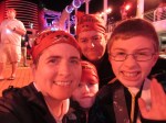 Pirate night was a blast. Everyone got a bandana to wear; many people went much further than that with their costumes. The kids have not cared one bit about getting their picture taken with any of the Disney characters, but I couldn’t pass up the chance to meet Cap’n Jack Sparrow, so we stood in line for 20 minutes for that. (Not sure why I thought a Hulk pose would make me look like a pirate. Kind of blew that one.)